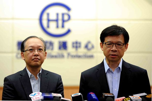 香港卫生防护中心及医院管理局埃博拉(伊波拉)病毒病联合简报会。 香港卫生署卫生防护中心总监梁挺雄医生(右)与医院管理局总感染控制主任曾艾壮医生,8月12日举行联合会议讨论香港因应海外爆发埃博拉(伊波拉)病毒病而采取的最新措施后。图为两人在会议后会见传媒。香港中通社图片