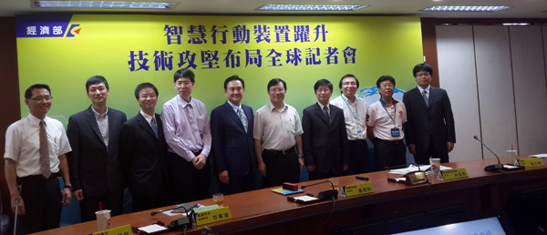 经济部技术处12日召开记者会,展现政府推动「智慧行动装置相关研发计画」阶段性成果,包括工研院及宏达电、钰创、友达、立*、联发科技等企业派代表与会。
