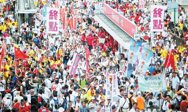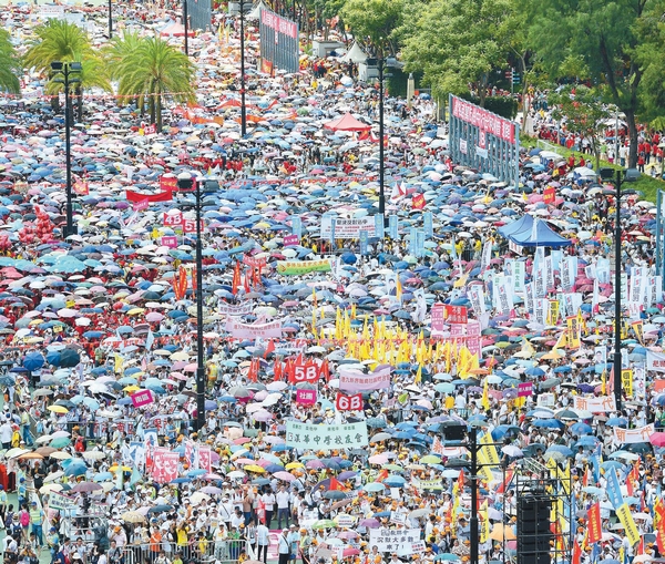 昨天,烈日當空,維多利亞公園依舊人山人海,軒尼詩道摩肩接踵,中環更是人頭攢動。香港市民紛紛上街遊行,表達「保和平、保普選、反暴力、反佔中」的訴求。遊行的主辦方「保普選反佔中」大聯盟初步估計,參加遊行者達到19.3萬人。
