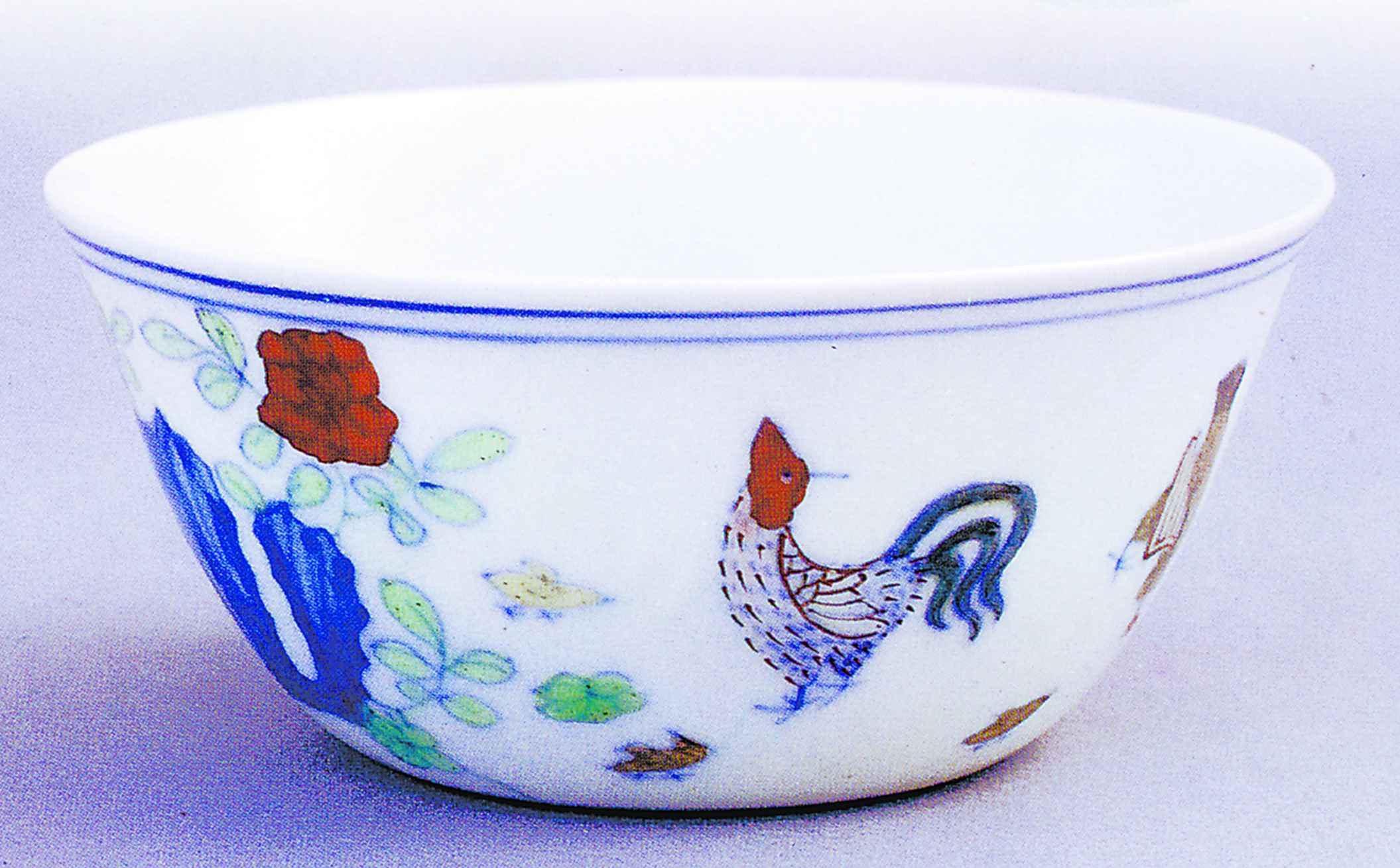 明代《神宗實錄》中有記載說,「御前有成杯一雙,值錢十萬」。指的是皇帝跟前有一對小巧的鸡缸杯,當時就值錢十萬,不是確指某一個數字,而是價值連城的意思。斗彩工藝是先用青花勾勒出輪廓線,再在這個輪廓線內填上彩,但凡這種工藝都叫斗彩。斗彩瓷里面,最有名的便是鸡缸杯。