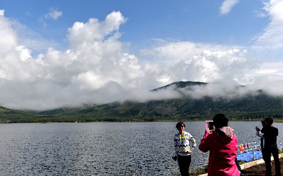 游客在阿尔山杜鹃湖边游玩(8月18日摄)。