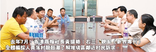 去年7月,香港商報社長黃揚略(右三)親率《新界專刊》全體編採人員落村龍鼓灘了解堆填區鄰近村民訴求。(记者冯俊文摄)