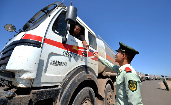 8月20日,一名边检战士在检查出关车辆司机的证件。