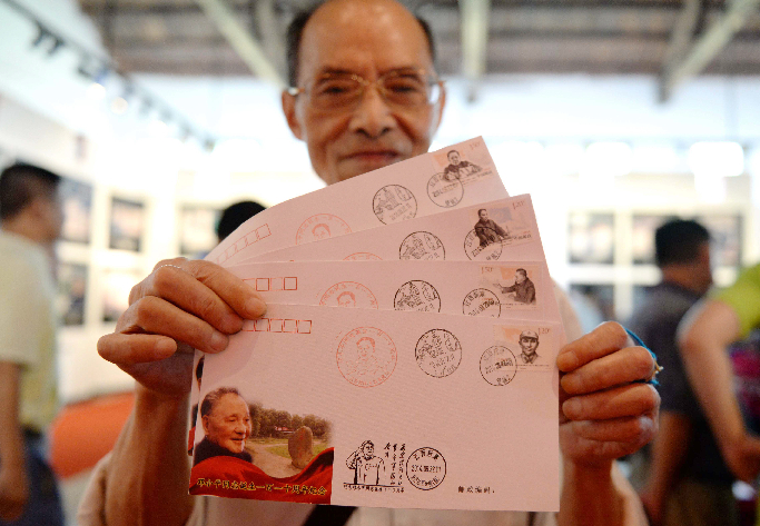 8月22日,77岁的南昌市民袁享根展示刚刚买到的贴有纪念邮票、盖有纪念邮戳的纪念信封。