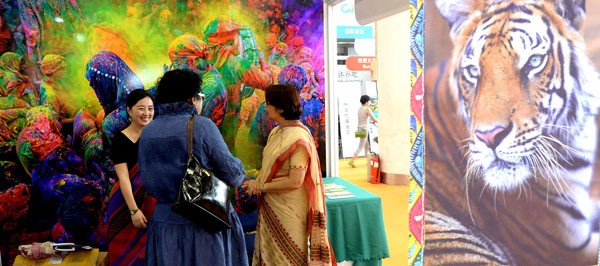 8月23日,客商在印度展位上交流。