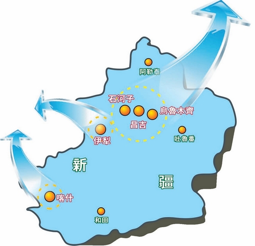 霍尔果斯(伊犁)、喀什两个国家级特殊经济开发区,以其为二级增长极,充分发挥这些城市在「丝绸之路经济带」沿线沿边地缘优势,并提升南北疆沿线城市的竞争力,提高南北疆产业带的经济发展能力。