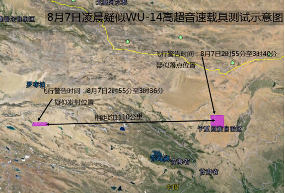 资料图:根据NOTAM飞行通告显示,8月7日凌晨2时36分至3时40分,中国在西北地区再度进行发射活动。其中,发射位置为西北罗布泊以南地区,另一位置(疑似落点)为内蒙古阿拉善盟西侧,相距约1110公里。这可能是第2次WU-14高超音速载具飞行测试。