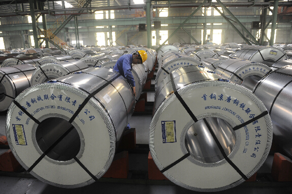 工人在首钢京唐钢铁公司冷轧钢卷成品车间工作