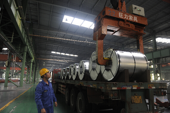 工人在首钢京唐钢铁公司冷轧钢卷成品车间吊装产品