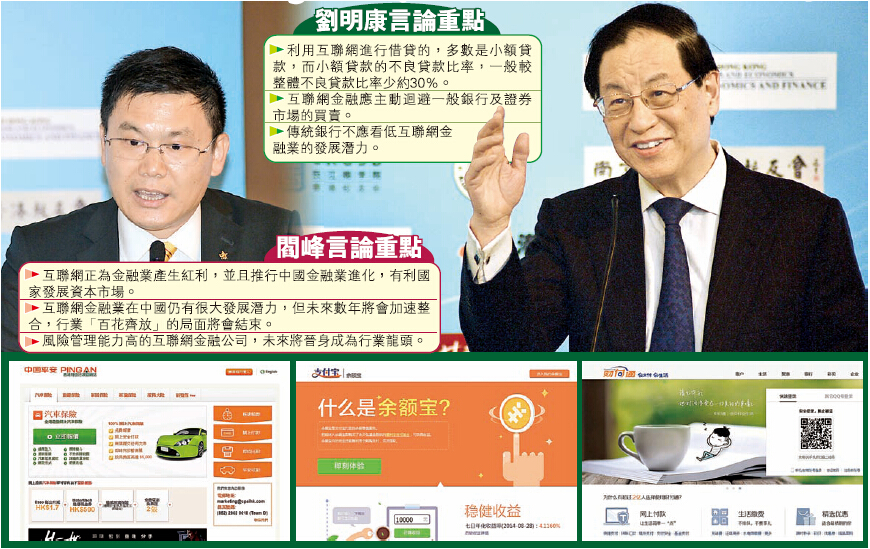 劉明康昨日出席「2014香港互聯網金融高峰論壇」時說,互聯網金融公司主要從事小額貸款,而小額貸款的不良貸款比率,一般較大額借貸為低,認為至目前為止,互聯網金融尚未為整體金融系統帶來風險。他引述數據指,於今年7月份,內地小額貸款的不良貸款比率約為0.98%,較整體不良貸款比率低30%以上,反映互聯網金融業的違約情况尚未惡化。