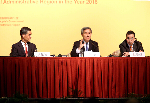 9月1日,全国人大常委会副秘书长李飞(中)在香港亚洲博览馆出席《全国人大常委会关于香港特区行政长官普选问题和2016年立法会生成办法的决定》简介会。
