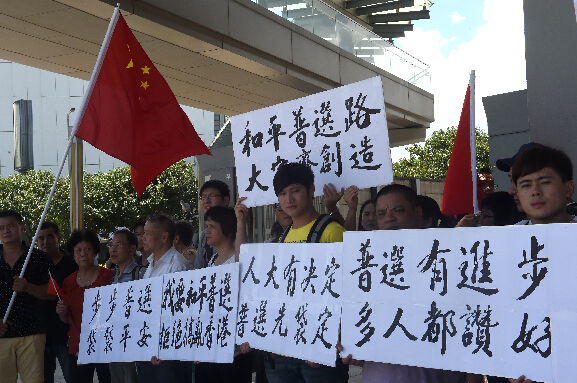 香港举行政制简介会 有市民在场外支持人大决定。 9月1日,《全国人大常委会关于香港特区行政长官普选问题和2016年立法会生成办法的决定》简介会在香港亚洲博览馆举行,图为有市民在会场外集会,支持全国人大常委会就香港政改问题作出决定。