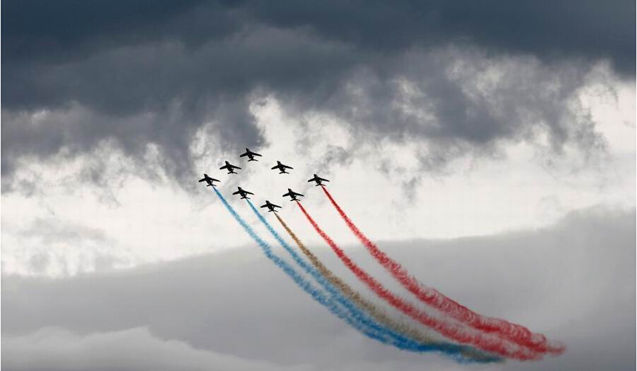 当地时间2014年8月30日,瑞士帕耶讷,各国空军飞行表演队展示飞行技艺。瑞士帕耶讷举办大型航展,庆祝瑞士空军成立100周年。
