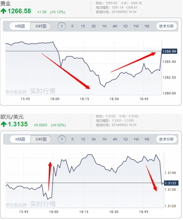 乌克兰方面消息公布后,欧元大涨,黄金下挫,但俄罗斯方面“否认”后, 两者有所回调: