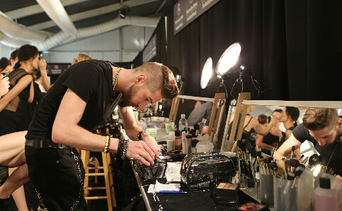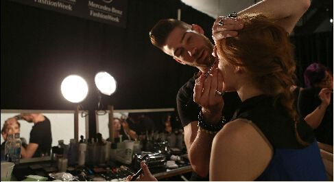 在美国纽约林肯中心,一名化妆师在时装秀后台为模特化妆