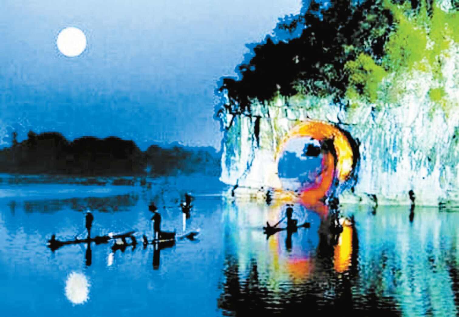 桂林的象山,象鼻和象身中間有一水月洞,江水從洞中橫貫而過。每到中秋之夜,皓月當空,駕小船駛入水月洞,呈現出「水底有明月,水上明月浮;水流月不去,月去水還流」的景觀。在月夜里撐竿灕江中,不失為一種雅興。龍竹搖曳,群山作陪,月影隨漣漪蕩漾,一生的追求不過如此。