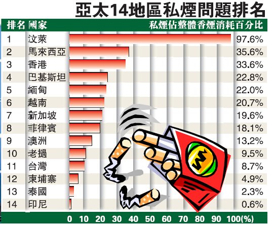 在亚太14个地区中,香港的私烟问题排名第三,仅次於汶莱及马来西亚。