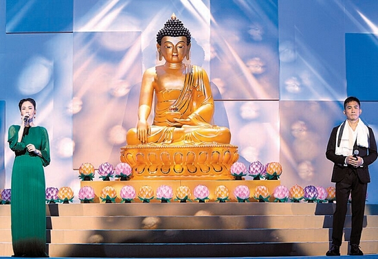 「爱的六字真言」祈愿点灯晚会昨晚假九展圆满结束,圈中多位笃信佛学的艺人,皆有入场听佛偈,包括︰关之琳、锺镇涛(B哥)、江欣燕、袁咏仪、关秀媚与姚子羚等。大会并请来两位天王天后梁朝伟(伟仔)与王菲历史性地合唱《心经》,伟仔自爆因此事前向「歌神」张学友请教歌技!                                                                                              香港商报记者 翠珊 摄影记者 阿文