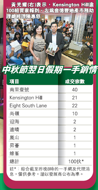 【香港商报讯】记者刘思桐、朱乐恩报道:中秋翌日假期新盘销情炽热,单日共售100伙,其中华人置业(127)的「南里壹号」沽40伙居首,其次为会德丰的「Kensington Hill」沽21伙,与新世界的「Eight South Lane」沽22伙叮当马头。