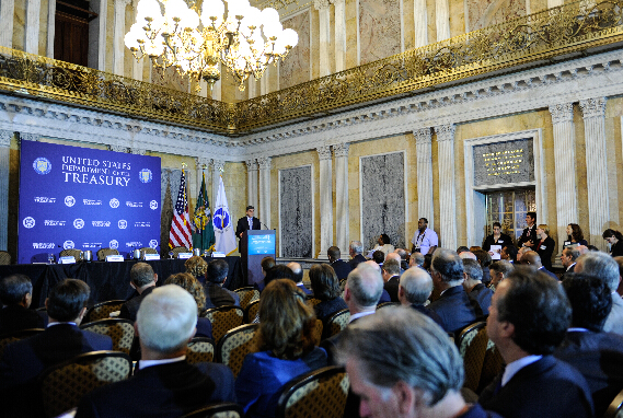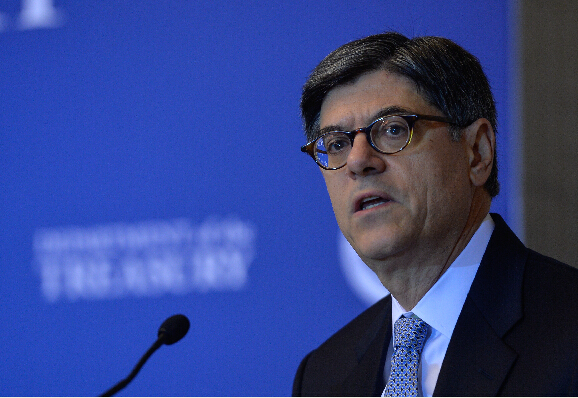 9月9日,在美国首都华盛顿,美国财政部长雅各布·卢在财政部和运输部举办的基础建设投资论坛上讲话。
