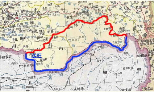 中印东段边界示意图,红色为实际控制线即“麦克马洪线”,蓝线为中国主张的中印边界线,两线中间为中国藏南地区(印度称阿鲁纳恰尔帮)