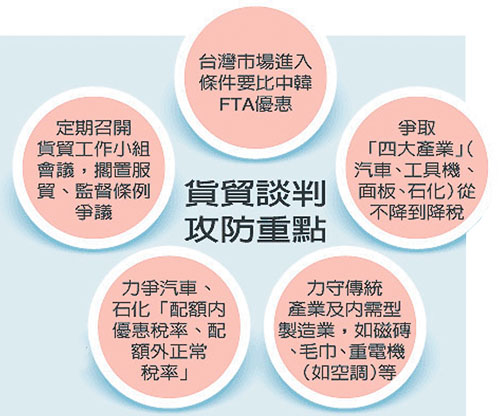 除了台灣提出希望納入降稅產品外,陸方也極力爭取台灣開放農產品及民生用品等。由於上述屬島內較為弱勢產業,台灣將全力力守農產品不開放、為弱勢產業爭取緩冲等原則,此外,為替台廠守住大陸市場,也將爭取貨貿至少不要晚於中韓FTA半年簽署。