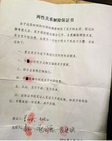 齐晓红晒出的这份保证书签署于2014年1月17日,内容为:双方自愿解除两性关系,男方一次性补偿女方贰拾万元整,并保证:1、男女双方今后不再进行任何电话联系;2、不以任何方式相互骚扰双方家庭;3、即日去医院打掉胎儿;4、不散播任何对双方不利的信息;5、从此互不干涉互不往来。