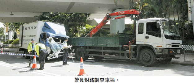 据吊臂车姓梁司机表示,事发前他准备到西环工作,途经上址停车在路旁,到附近公园如厕,返回时发现两辆货车一前一后疾驰而至,期间后车疑想爬头,抽头越过慢线,却失控撞向其泊在路边的吊鸡车车尾。