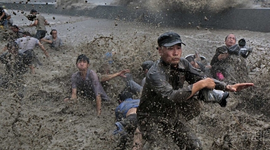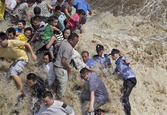 每到农历八月十八前后,有成千上万的人涌到钱塘江边看潮,场面远胜西班牙斗牛。图为2008年9月15日,数万中外游客在海宁盐官观看一线潮。摄影:王芯克/青年时报