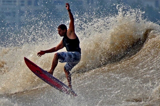 老外钱塘江冲浪,引起杭州市政府重视,派专人进行调研,于2008年8月1日至5日,邀请巴西和美国冲浪手来钱塘江试冲浪成功,从此,冲浪列入杭州国际观潮节的表演项目。