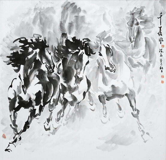 今年初文化部主辦的《美術中國》、全國政協辦公廳主辦的《畫界》先后為陳石出版繪畫作品專輯,通觀畫集中的數十幅山水畫,深感陳石很好地繼承了傳統中國畫的皴、擦、點、染等技法,熟練運用南朝謝赫所說的氣韻貫通、骨法用筆、應物象形等「六法」,已經具有很高的專業繪畫水平。其《南山頌壽圖》、《觀瀑》等作畫面靜謚,古氣悠然,構圖巧妙;而《雲起圖》、《苗家初秋》等,取高遠構圖,雄山挺立,流雲環繞,村居點綴其間,畫法上深得黃賓虹之法,皴擦后層層積染,強化山勢的厚重感;其盈尺小幅,如《一葉小舟》、《初春》等作,均布局合理,悠然自得,有咫尺千里之勢。早年聞名於畫界是陳石所畫的馬,他愛畫馬,也擅長畫馬。他畫的馬造型準確,明暗對比強烈,用筆沉著痛快。講到陳石畫馬,幾乎成了他在書畫領域的標誌。我曾從報刊雜誌多次剪集下陳石的畫馬之作。此次《美術中國》、《畫界》出版的陳石專集,也收錄了他的數十幅畫馬之作,貴州國畫院院長陳爭為其專刊所作的序言中講,他畫的馬「是以書入畫一路,以線造型,力求在快意酣暢的書寫中完成對形象的塑造。陳石筆下又多了奇峰峻嶺,水霧山嵐,在山石樹木雲烟的勾皴點染中,這種全面修行的優勢更加清晰地凸顯出來,難怪他畫的山水,不論尺寸大小,都會有一種氣勢磅礡的感覺」。陳爭所言極是,我與陳石皆近花甲之人。知其數十年來喜繪畫,幼年以自己所喜的連環畫為教材,進行反覆臨摹,均像模像樣,「文革」期間轉研國畫,素描、色彩等均能極好的把握。真正致力於中國繪畫藝術,應該是在改革開放初期,看到了齊白石、徐悲鴻、黃賓虹等的精妙之作,中國畫特有的韻味美、筆墨美,和散點透視表現出來的咫尺千里、隨類賦彩之美,深深地觸動他那喜愛繪畫的藝術神經。多次嘗試臨摹,雖能達到形式,但自覺尚缺神韻。