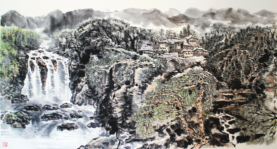 陳石,自幼即有繪畫天賦并樂此不疲,雖身為公務員,任重事繁,但畫作仍常見於報刊雜誌。北京釣魚台國賓館收藏其六尺整張的山水畫作《黔山秀水》,并將該畫懸挂於賓館總統樓團長客廳室。《黔山秀水》圖橫向取勢,構圖嚴謹,氣韻貫通,筆墨趣味足,賦彩隨類而明快。畫右,中、下兩處蒼勁老樹對應成趣,樹干微染赭石,右中層層積墨取茂密叢林之勢,右下兩棵大樹枝葉橫呈,染以石綠,小溪與曲徑穿插其間,通往山間的凸橋上是吊腳木樓村寨,往上為流雲過渡后韻味極佳的淡墨遠山;再往左(中間部分)為峭崖深樹過渡后,是遠山幽處而來的瀑流,瀑流下為灘石、水面。水面構成的留白處,使畫面顯出空靈感。整幅畫很好表達了貴州山水的蒼莽氣勢而不失秀潤靈動之感,遠山近水、樹叢幽徑、凸橋木屋,觀后即感熟悉,也令人嚮往,使人心靜。特約撰稿馬天雲