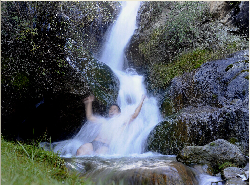 在拉萨郊区,一名藏族青年山谷间流下的小溪里沐浴