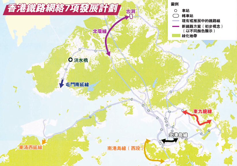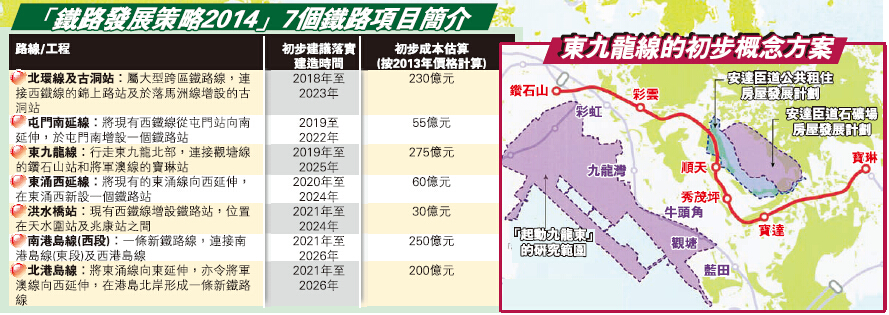 運房局昨日公布的「鐵路發展策略2014」策略,是參考了兩輪公眾諮詢所收集的意見、顧問其後就此作出的總體建議.提出於2026年或之前推展7個新鐵路方案(見地圖及附表)。以2013年的價格計算,總成本為1100億元。