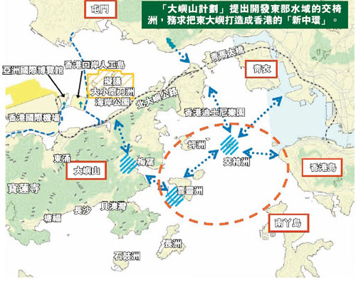 事實上,「玫瑰園計劃」涵蓋的地區有限,只以東涌及赤龃角為中心,未有輻射至大嶼山其他地區;但今天的「大嶼山計劃」卻提出開發東部水域的交椅洲,務求把東大嶼打造成香港的「新中環」,再配合機場北及港珠澳大橋香港口岸發展商業活動,10至20年後的大嶼山,將成為繼維多利亞港兩岸以外,香港另一商業及社會的核心區域。