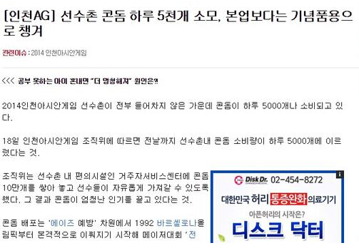 据韩国仁川亚运会组委会当天披露的消息,运动员村一天的避孕套消耗量达5000个之多。相关人士称:“对很多选手而言,这些避孕套不是必需品吗,而是当作亚运会纪念品的一种来收藏”,对避孕套如此的高人气显得有些无奈。