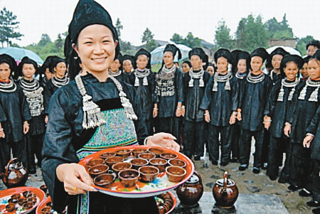 在水族群眾中流傳著一個古老動人的故事。據傳,很久很久以前,有九位貧窮的老婆婆來到水族聚居的地方乞討。好客的水族群眾熱情地周濟照料她們,拿出糯米飯、糯米粑供她們食用。她們感受到水族群眾熱情好客,就把釀酒技術傳授給水族人民,化作九位仙女飄然而去。人們為了紀念這九位仙女,就把按照仙女傳授的技術釀成的酒稱為九仙酒,后來把水族聚居的地方叫做九仙鎮,漢譯為「九阡酒」和「九阡鎮」。