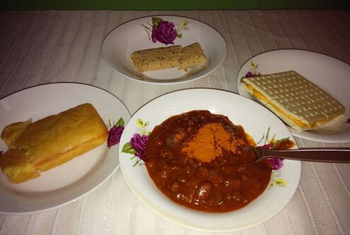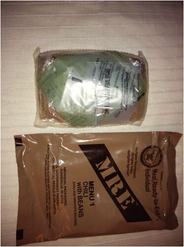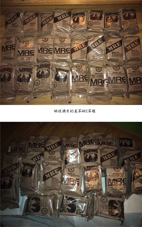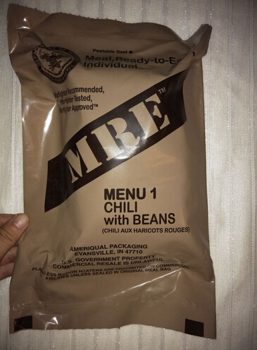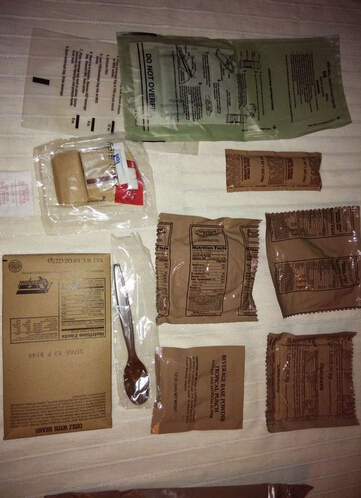 现役军粮美军MRE(Meals Ready to eat)。常温下的可用期10年(120个月),保质期5年。针对阿富汗和伊拉克的研究发现,一个典型的活跃男性(18-30岁),每天消耗4200千卡的热量。而一个战地的士兵,即使在供应充足的情况下,往往只摄入2400大卡的热量(将他们的口粮丢弃或与人交换物品)。这导致了许多士兵处于营养的负平衡状态,并影响到他们的士气和作战能力。因此,美军有意识地在最新的战地口粮配方中提高了热量。