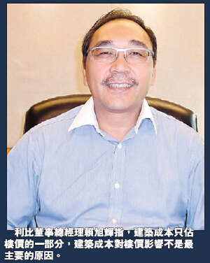 近期部分發展商指由於建築成本高企,故樓價難跌。既然「綠色建築」會增加成本,按照發展商的說法,樓價更不會下跌了。不過,利比董事總經理賴旭輝不同意這種說法。他說,建築成本只佔樓價的一部分,建築成本對樓價影響不是最主要的原因。樓價走勢要視乎市場供求情況而定。