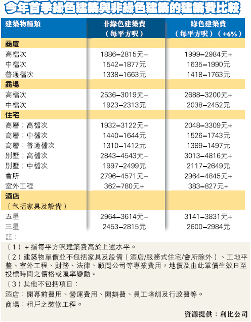 據利比提供的資料顯示,普通檔次的高層住宅綠色建築費最低每平方呎價為1389元,連同會所和室外工程計算,即建築費每平方呎為4736元。保守估計,這類普通檔次的住宅項目地價每平方呎至少約3000至4000元,與上述建築費加起來,也要約7700至8700多元,這還未包括息口、家具及設備、工地平整、室外裝修、財務、法律、顧問公司等專業費用。按此推算,未來每平方呎售價至少也要1萬元才可以獲微利。