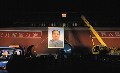 前日23时57分,一辆吊车从天安门城楼中间门洞驶出,并在门洞东侧就位,一辆运载着崭新画像的货车随后开出。悬挂了一年的毛泽东旧画像被吊车吊起,缓缓被摘下。随后,吊车将新画像吊起,40分钟后完成安装。