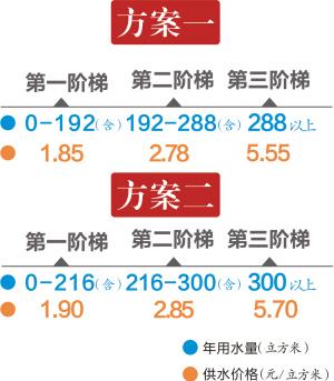 方案一:第一阶梯户年用水量为0-192(含)立方米,供水价格为每立方米1.85元;第二阶梯户年用水量为192-288(含)立方米,供水价格为每立方米2.78元;第三阶梯户年用水量为288立方米以上,供水价格为每立方米5.55元。