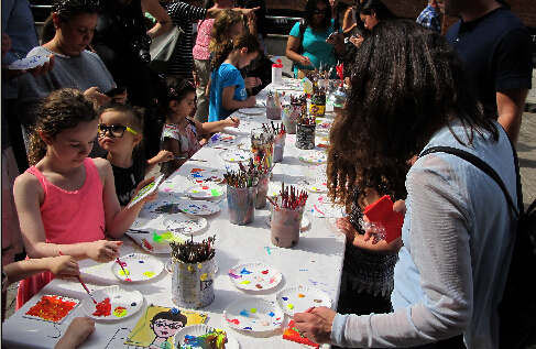 9月28日,孩子们在纽约布鲁克林DUMBO艺术节上体验绘画的乐趣