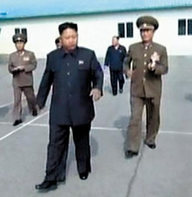 台朝鲜中央电视台25日播出金正日上月视察南浦市一家瓷砖工厂的纪录片。画面中金正恩走路时一瘸一拐,旁白说,尽管身体不适,他仍然像闪耀的火焰那样,不断照亮人民的道路。照片=朝鲜中央电视台