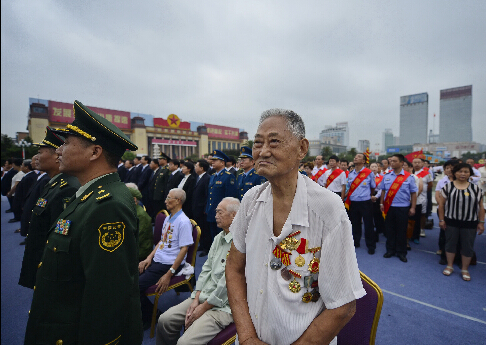 佩戴奖章的老战士在南昌八一南昌起义纪念塔前参加烈士纪念日活动