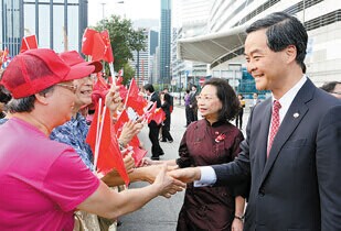 CY在國慶酒會上,與全國政協副主席董建華、中聯辦主任張曉明及一眾嘉賓祝酒。他致辭表示:「香港要繼續發展,便要同時發揮好『一國』和『兩制』的雙重優勢。『一國』的優勢是我們背靠祖國、國家大力支持香港的發展,內地的龐大市場亦為香港提供廣闊的事業發展空間;同時香港擁有不同於內地制度的『兩制』優勢,尤其是法制和金融制度的優勢。外國的商業機構、專業人士可以更容易掌握香港的法制和商業規律,因此,許多外地企業都願意來港拓展業務。『一國』和『兩制』的雙重優勢不只體現於經濟發展,亦體現於文化、藝術、教育、科研等範疇。」