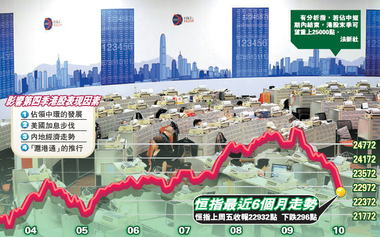 踏入第四季,港股後市能否重拾升勢,將主要取決於美國加息步伐、內地經濟走勢、「滬港通」及佔中事態發展。分析認為,倘佔中行動短期內解決,港股第四季可望重上25000點。