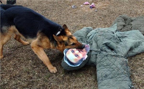 2013年4月7日消息(具体拍摄时间不详),朝鲜国家电视台展示了朝鲜士兵带军犬训练的片段,片中士兵让军犬撕咬贴有韩国国防部长官金宽镇照片的稻草人(下图)。