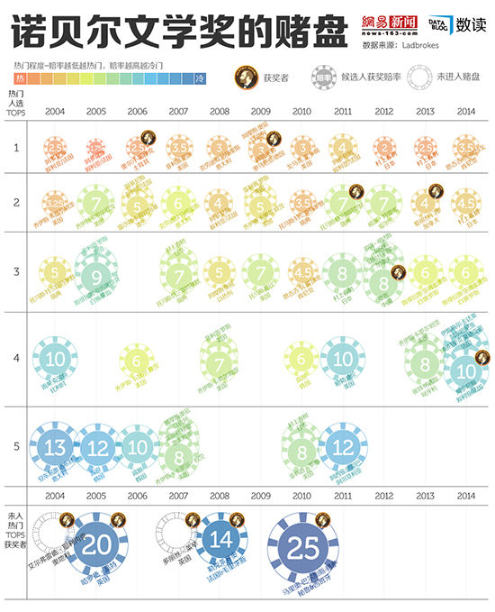 10月9日傍晚,诺奖委员会揭晓了今年的诺贝尔文学奖得主。法国作家帕特里克·莫迪亚诺被授予了该奖项。而得奖大热门——日本著名作家村上春树再次落选。每年文学奖公布之前,各种预测就会受到热切的关注,其中欧洲博彩巨头,设立在英国的立博博彩公司开设的赌局最具影响。据该公司(Ladbrokes)在开奖前最后的判断,肯尼亚作家恩古吉·瓦·提昂戈(Ngũgĩ wa Thiong'o)和日本作家村上春树最有可能获奖,二人的赔率分别为7/2和9/2(赔率越低说明作家越被认为可能得奖)。而今年的得奖者莫迪亚诺以10/1的赔率和其他两位作家并列第四。
