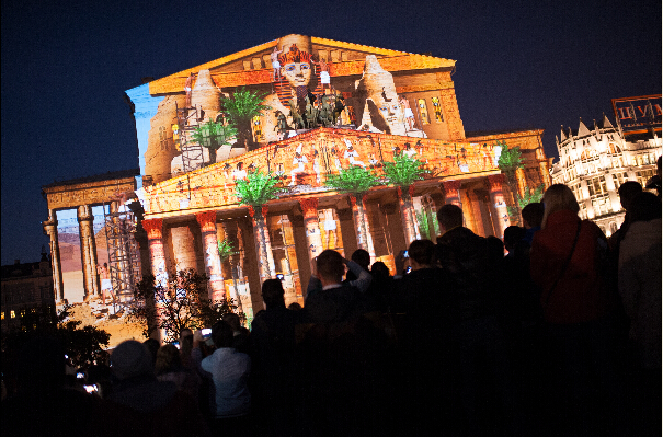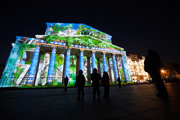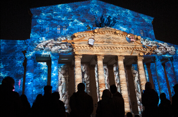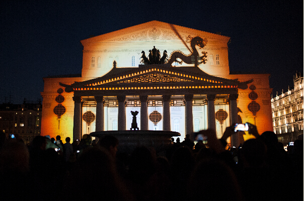 在俄罗斯首都莫斯科,参观者观看映射在国家大剧院主体上的炫彩灯光秀